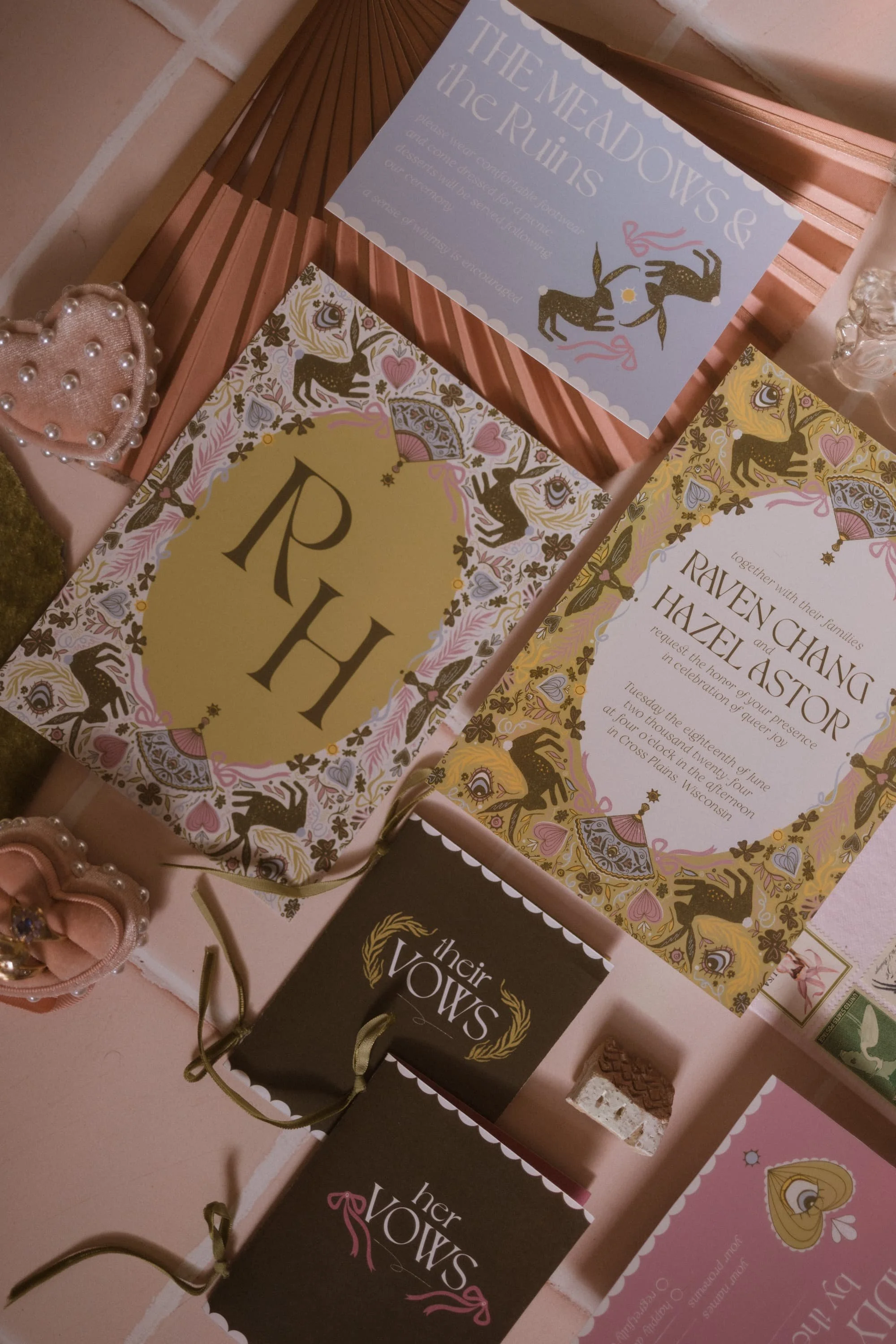 To begin, we’ll explore your love story & wedding plans to discover which styles and motifs can be woven through your designs. After a series of drafts and refinements, the final components will be sent out to our partners - impeccable printers and visionaries with the same attention to detail - or implemented on your website.